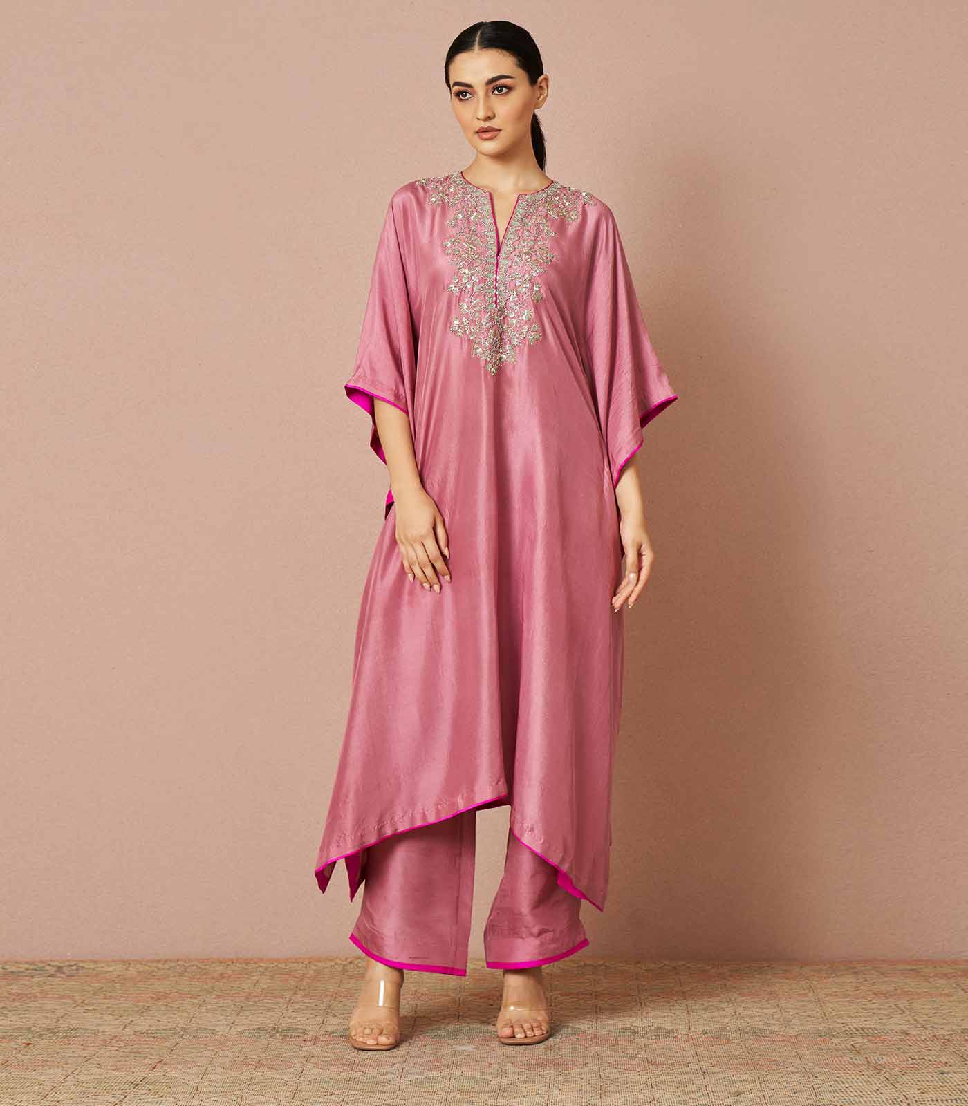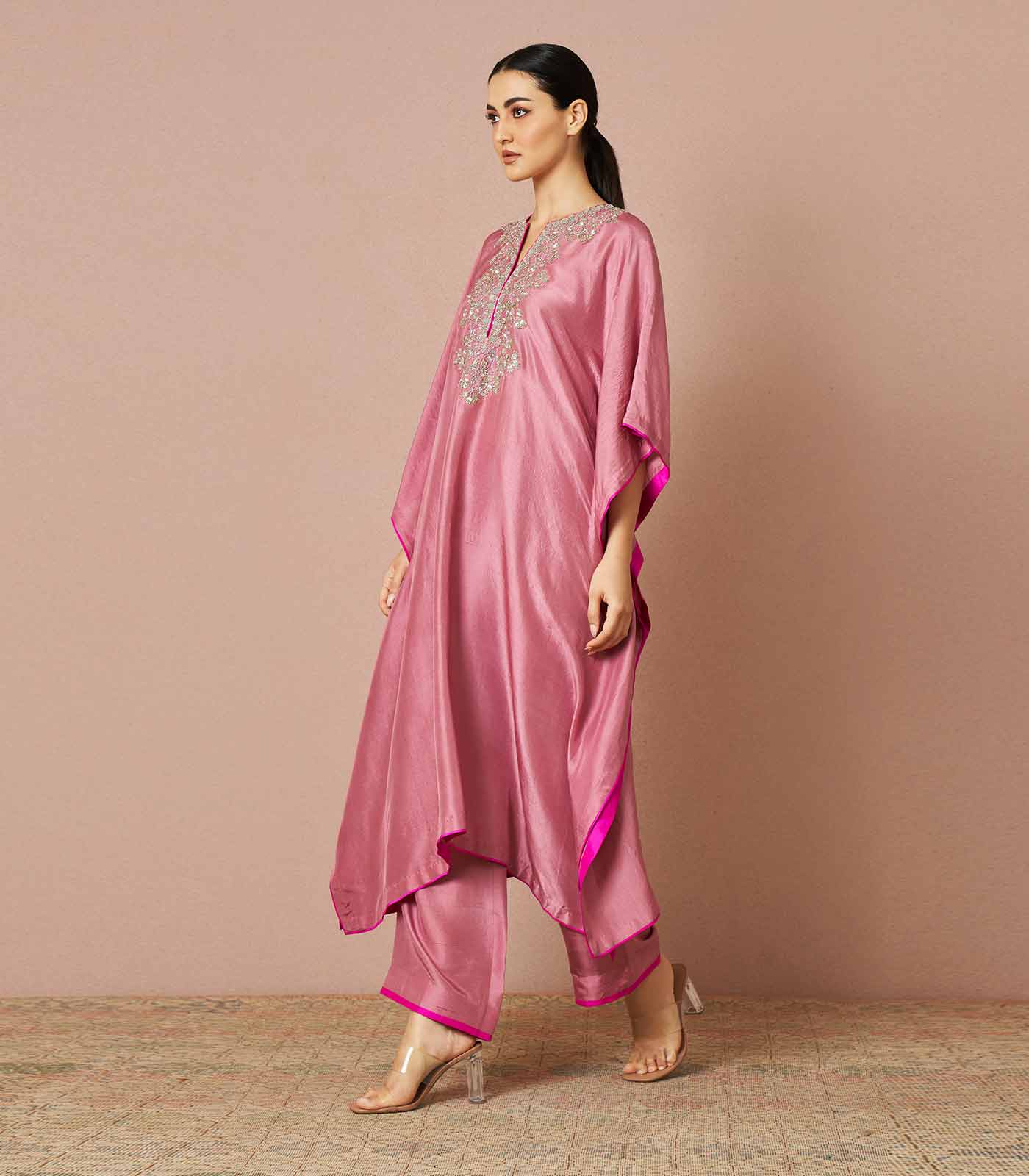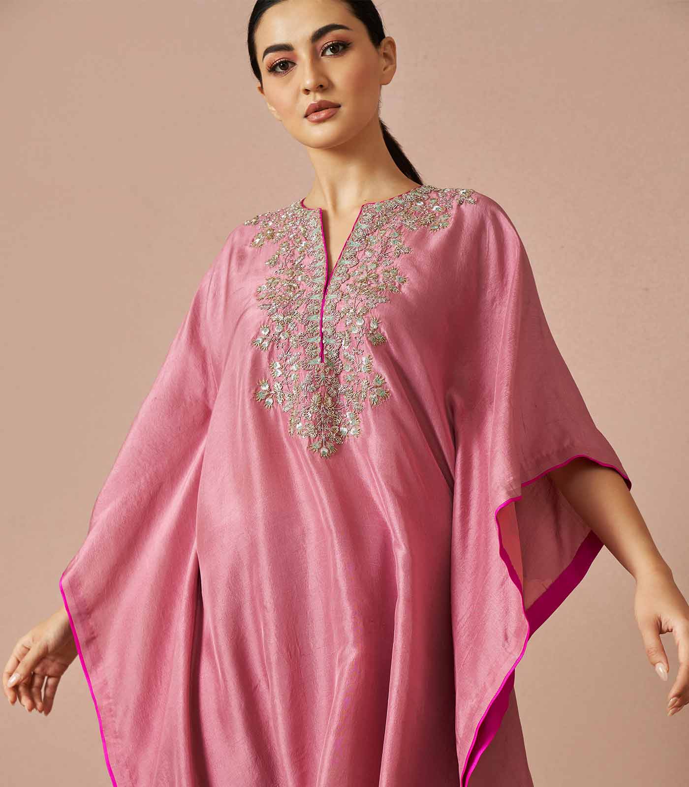 Our 'Zaina' Kaftan set comes with a pink silk kaftan embellished with stunning zardozi work, paired with straight silk pants, a complete charm.