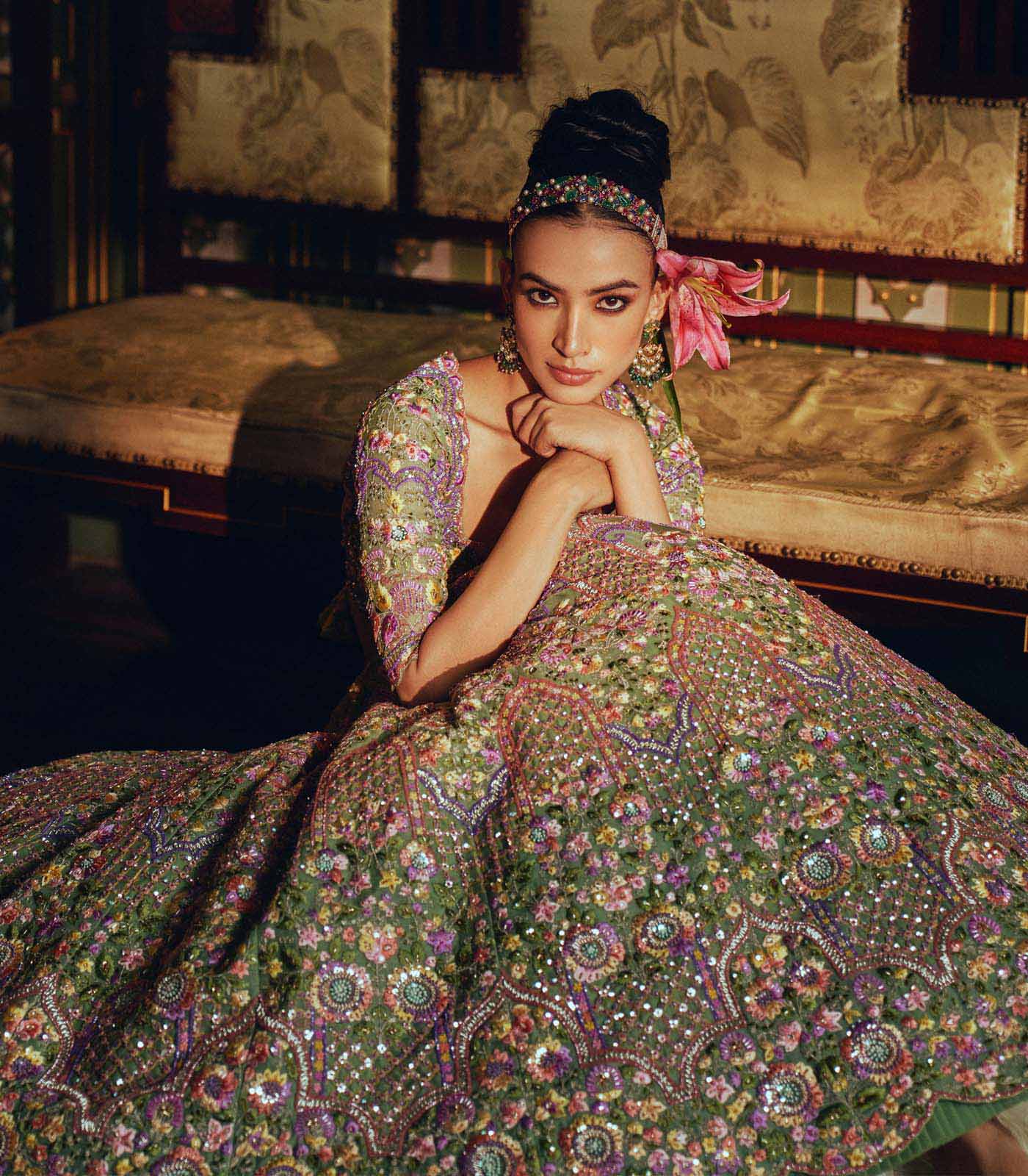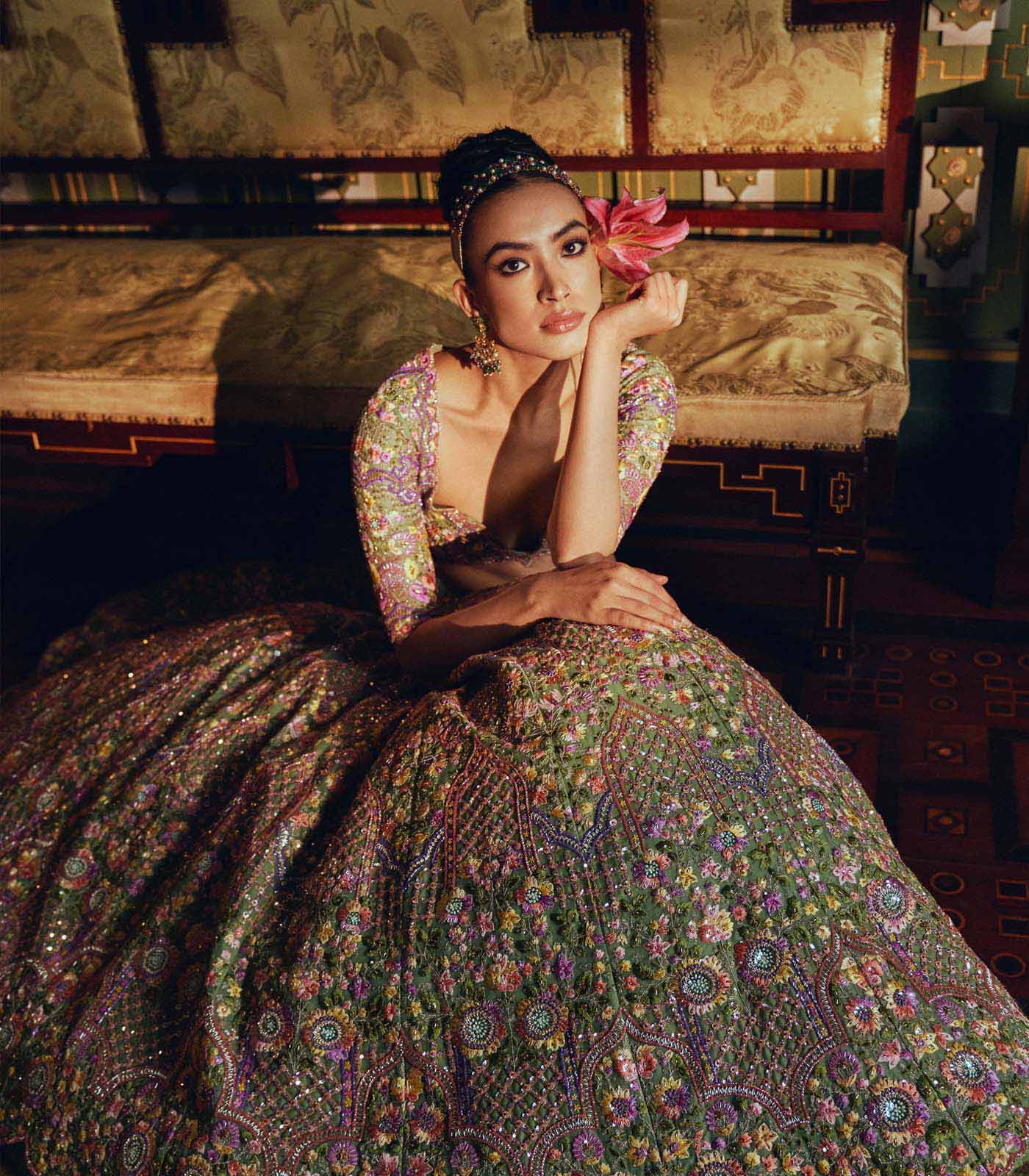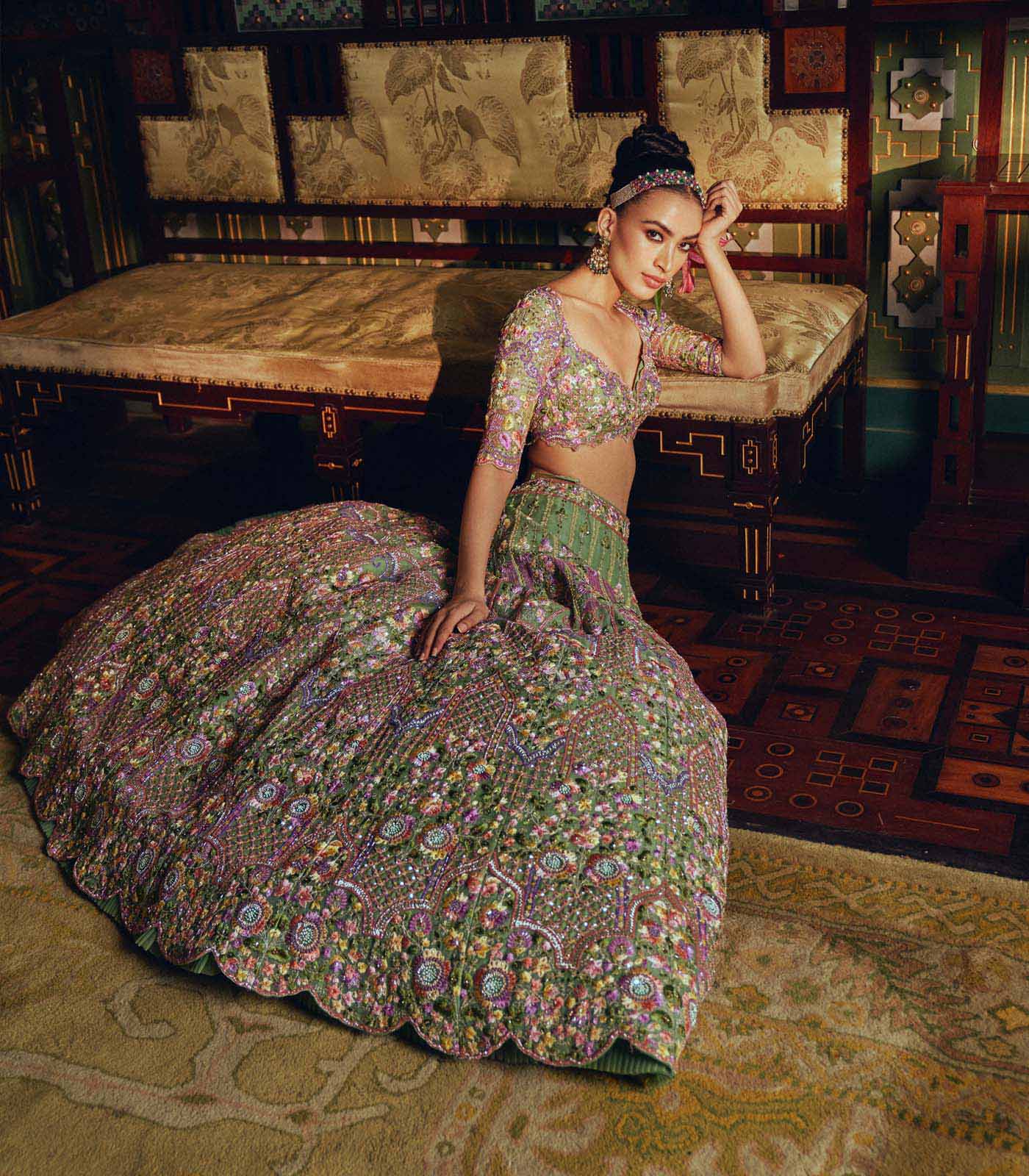 MINT GREEN ORGANZA MULTITHREAD EMB CUTDANA HILITED "ZINNIA" LEHENGA SET